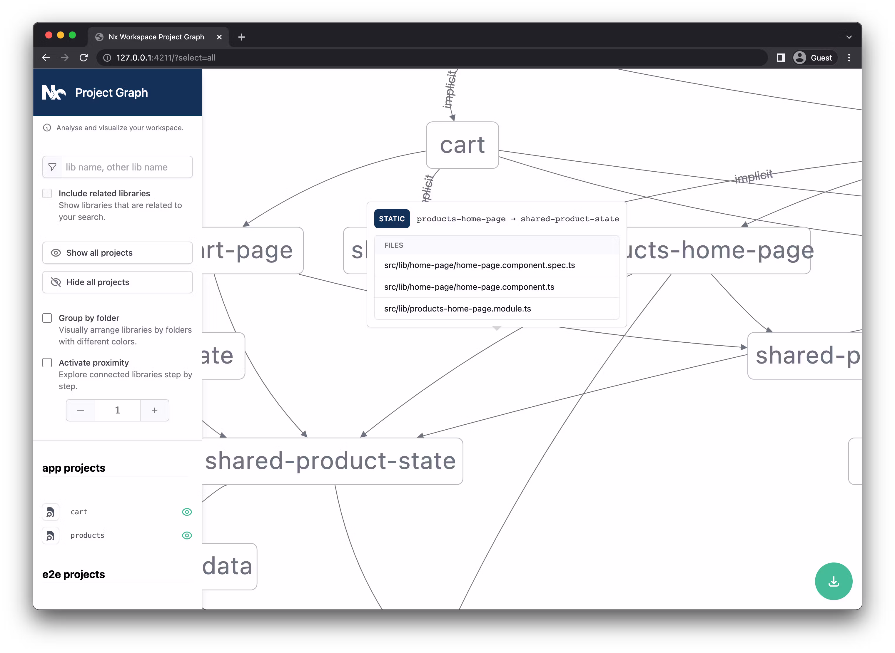 We keep improving our project graph and make it more and more useful for visually exploring your Nx workspace. You can now click on an edge and list the files that cause it which can be extremely valuable during debugging.